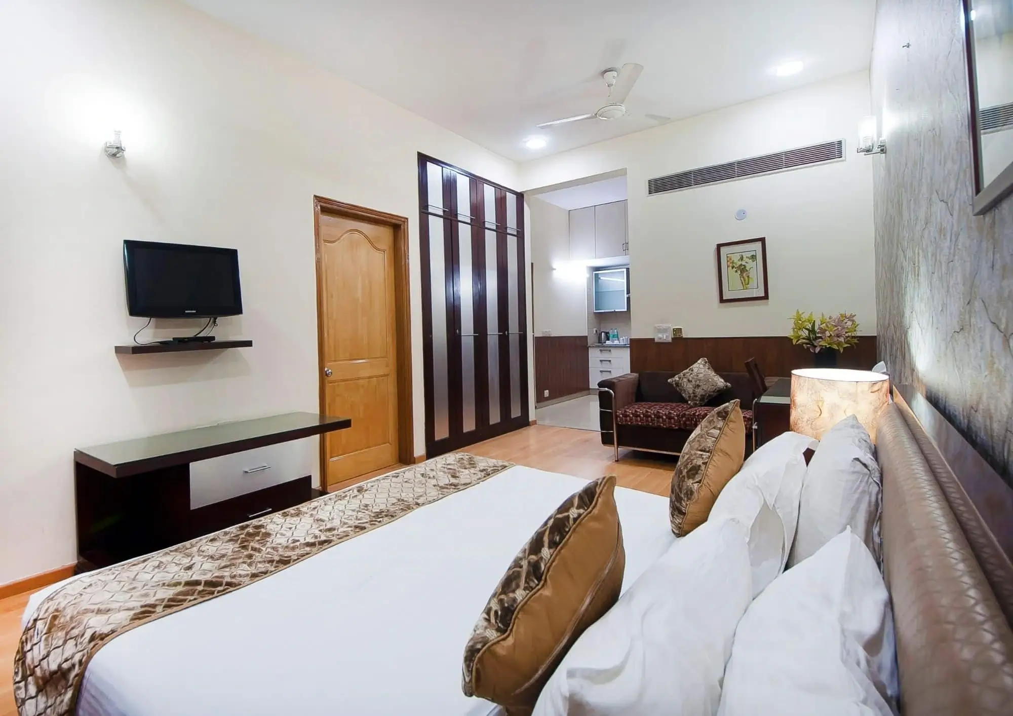 This apartment offer the fully furnished One Bedroom apartments near Fortis hospital. Our apartment is available for the short as well as for the long duration stay and this is the best place to stay for couples, corporate guests, small families for relocation, temporary accommodation and other guests. This apartment is well known for its luxurious services and the ideal place to stay for the corporate guests who are looking for the premium accommodation in Gurgaon. Our One Bedroom service apartment is built over an area of 800 sq. ft. and designed with good interiors and all the luxurious amenities are available in these apartment. Any family which is relocating or renovating their home will find our 1 BHK Apartments as the best place to give them a homely stay for a short period. Our guests can either cook their own meals in the fully functioning kitchen or give us a chance to serve them some delicious food.